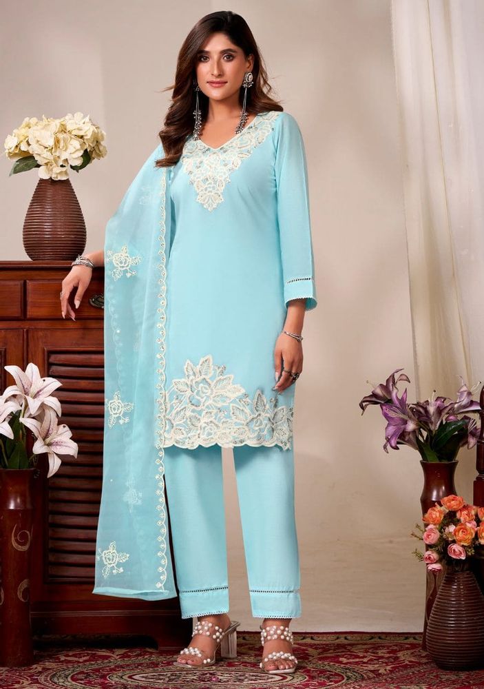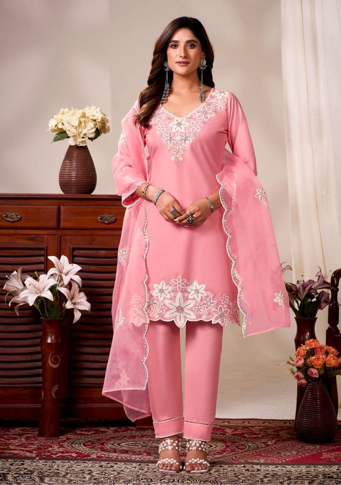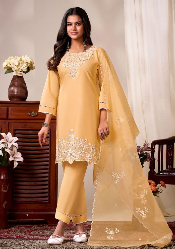 The top features include exclusive heavy embroidery that adds a luxurious designer finish. It is paired with a 100% pure organza dupatta, beautifully enhanced with embroidery work and fine scalloping, giving the outfit a graceful and premium appearance. The pure cotton bottom completes the set, keeping it breathable and comfortable for all-day wear. Designed as a ready-made collection, ANVI saves time while delivering a polished designer look with flawless fitting.