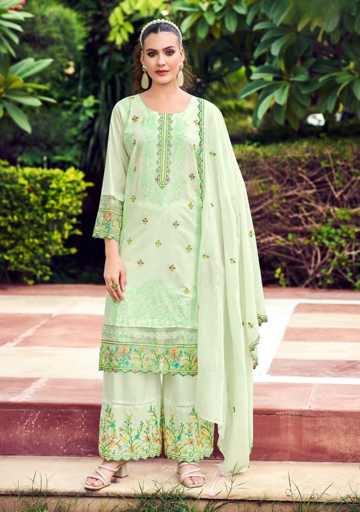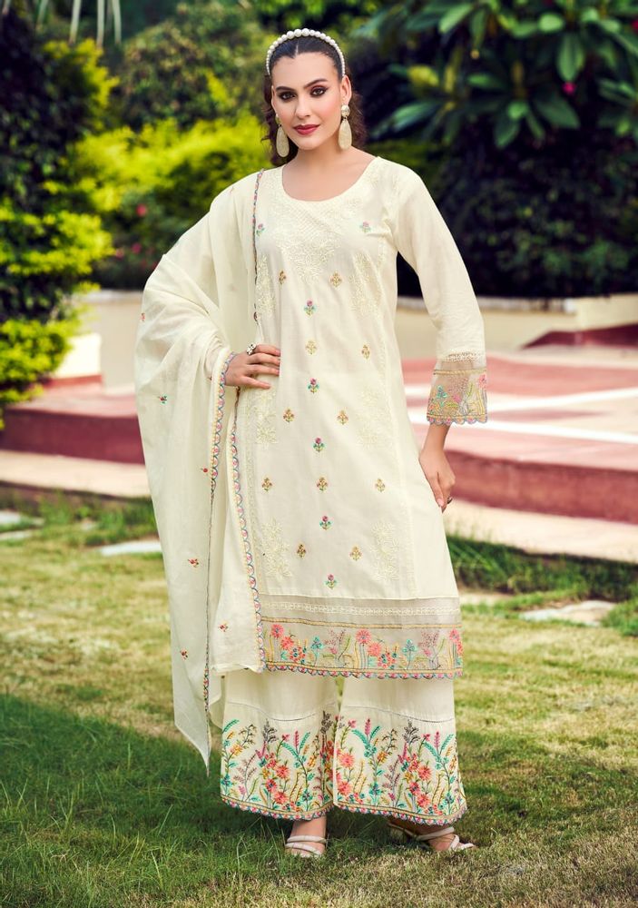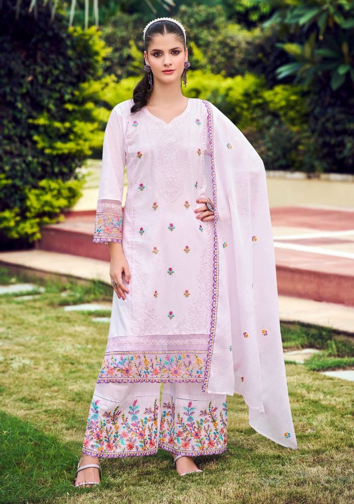 The outfit is paired with a soft embroidered mal mal cotton dupatta, which adds a graceful touch to the overall look. It also comes with a pure cotton embroidered plazo, making the set both fashionable and easy to wear for festive occasions, casual gatherings, or daily ethnic styling.