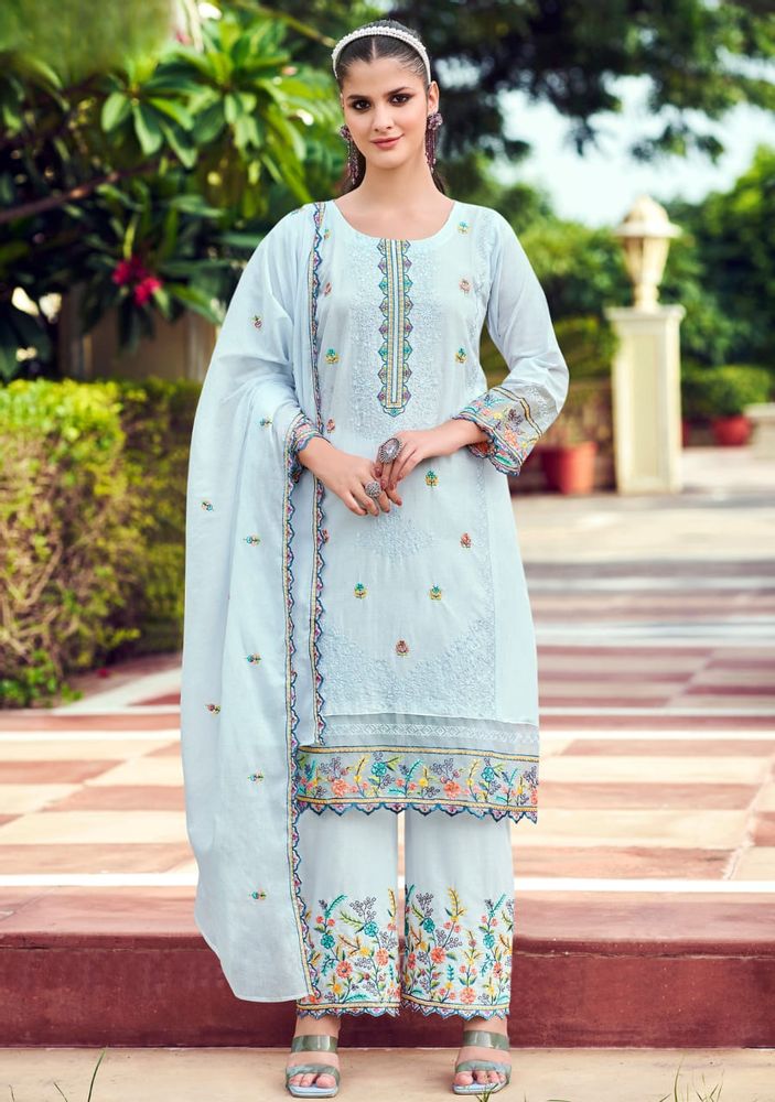 A perfect ready-made cotton embroidered suit set with plazo and mal mal dupatta for a graceful and stylish look.