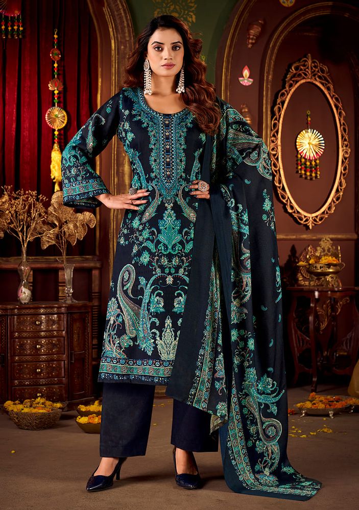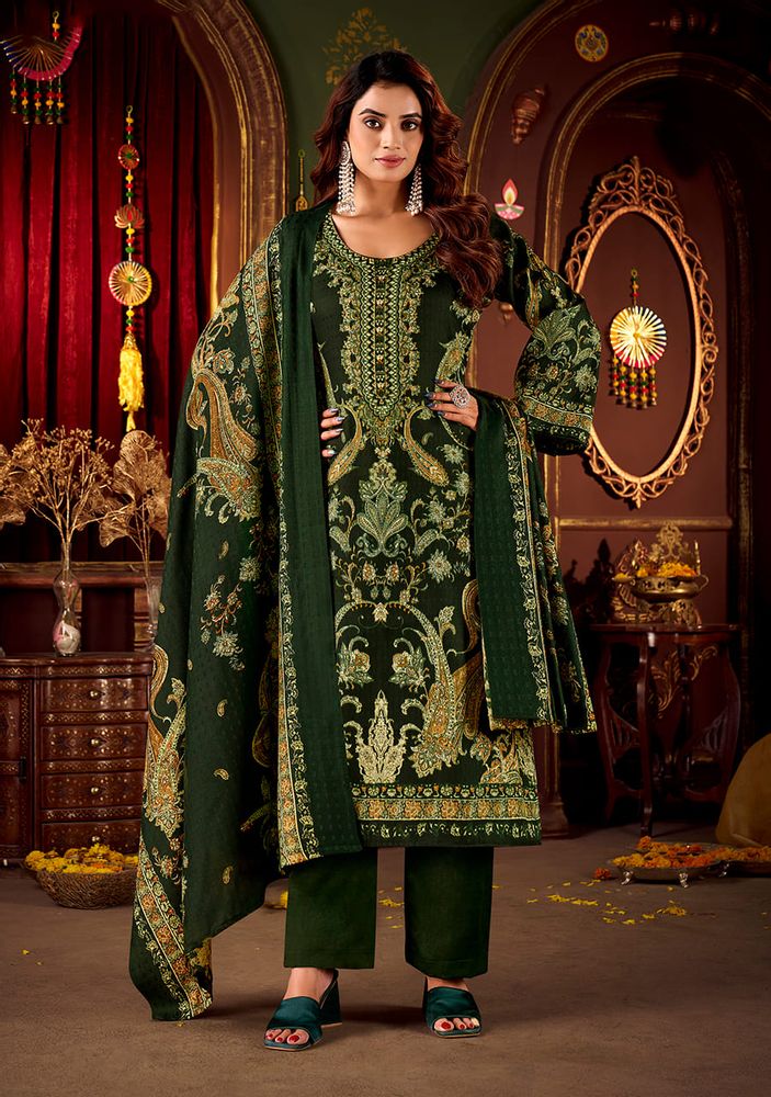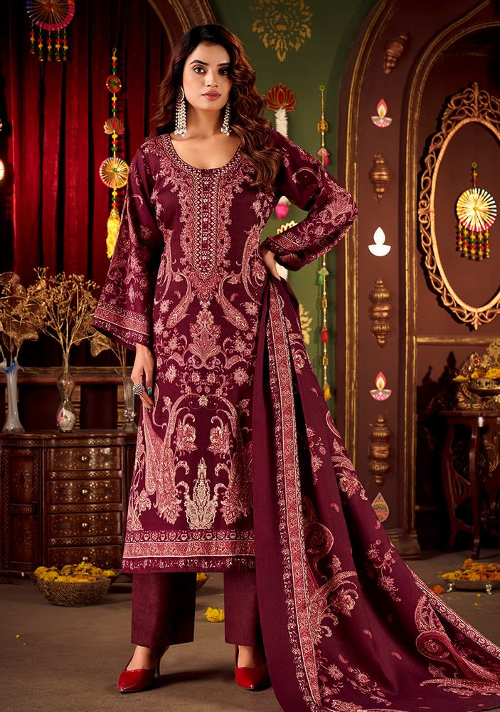 Each suit in this catalogue is made from pure woollen pashmina, offering a smooth, cozy feel that’s perfect for cold-weather wear. The beautifully woven pashmina shawl dupatta adds a classic touch, enhancing the overall look with effortless grace. Paired with the soft spun pashmina bottom, this set delivers both comfort and sophistication in every detail.