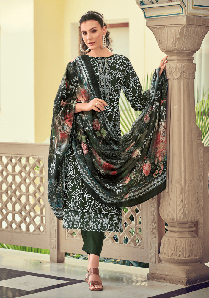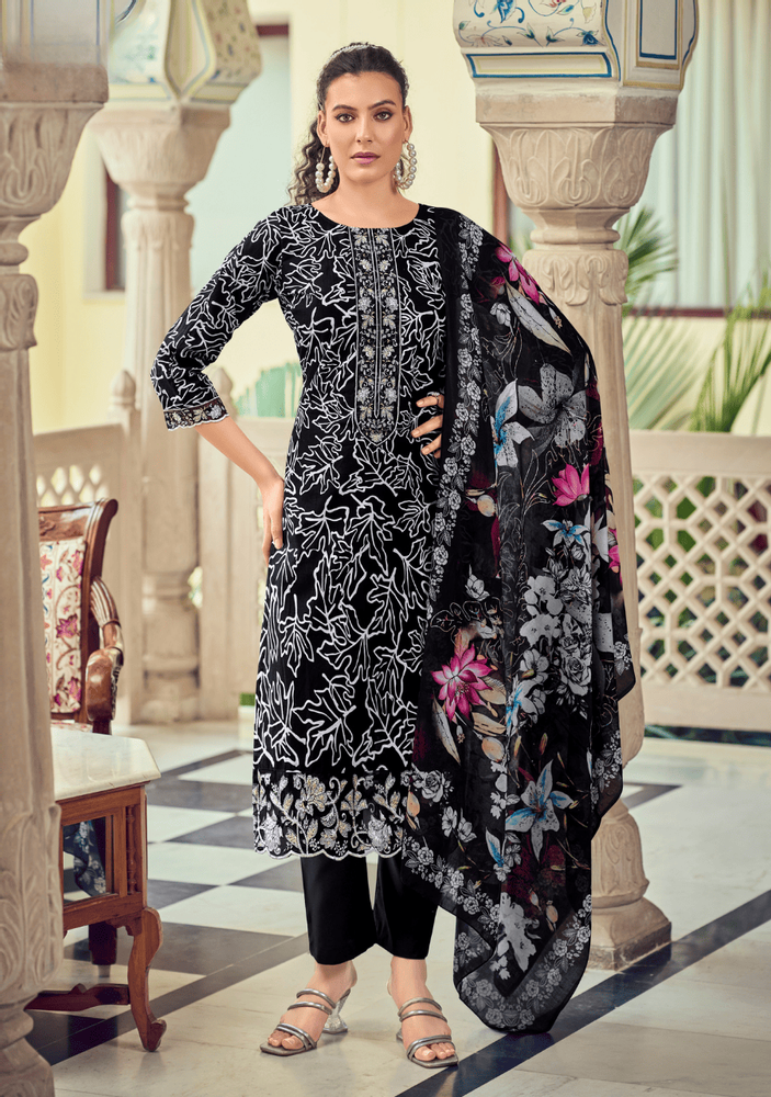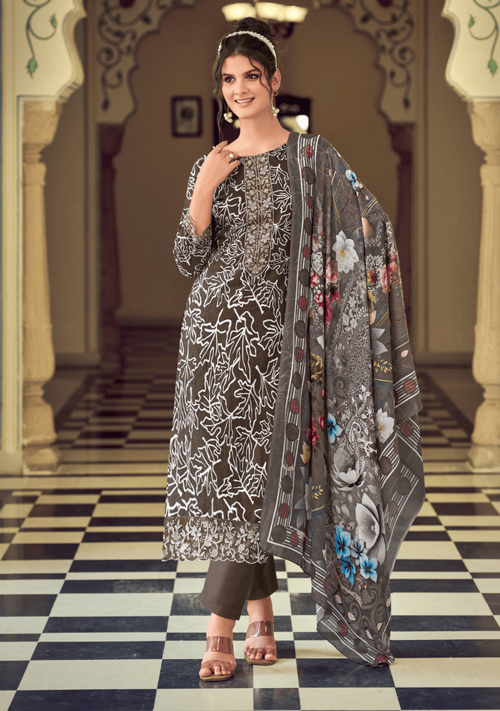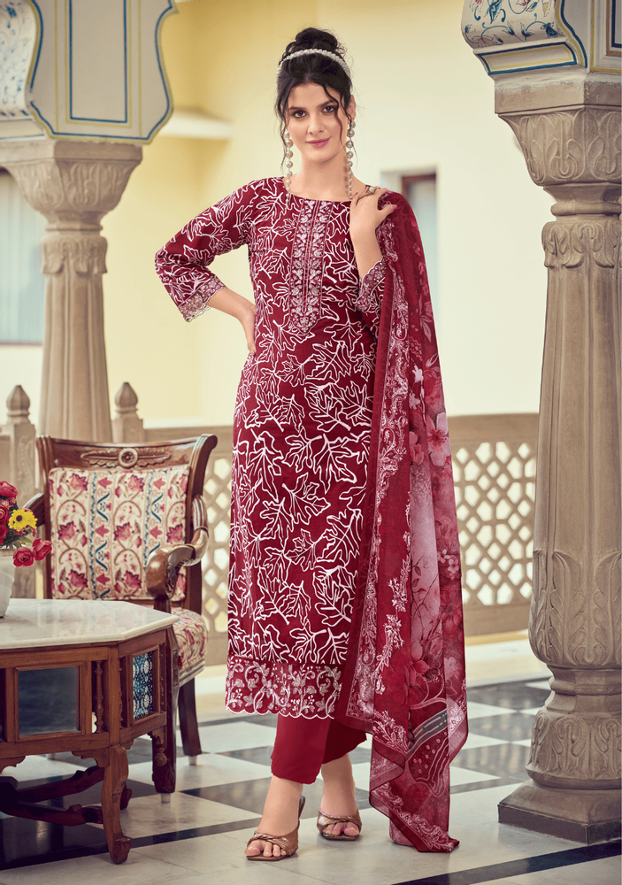 The kurti features elegant digital prints with heavy embroidery work on the neck, sleeves, and daman, giving it a rich and trendy look. Paired with a soft malmal cotton dupatta and comfortable bottom wear, this dupatta kurti pair offers both style and ease.