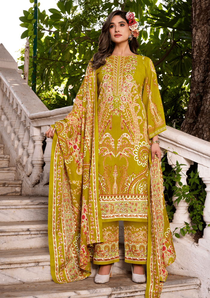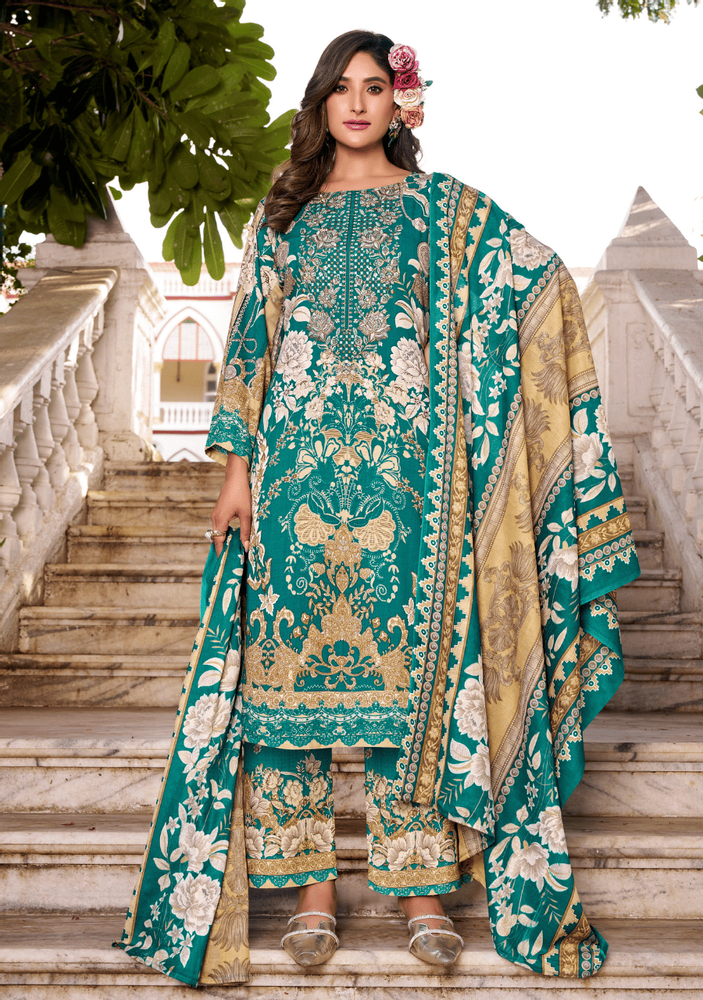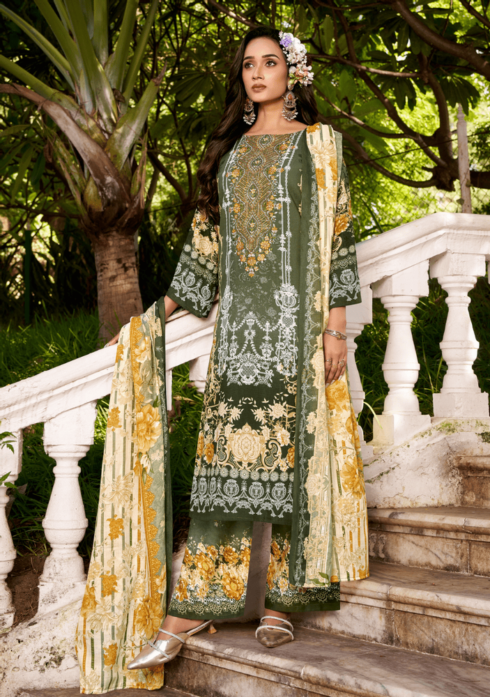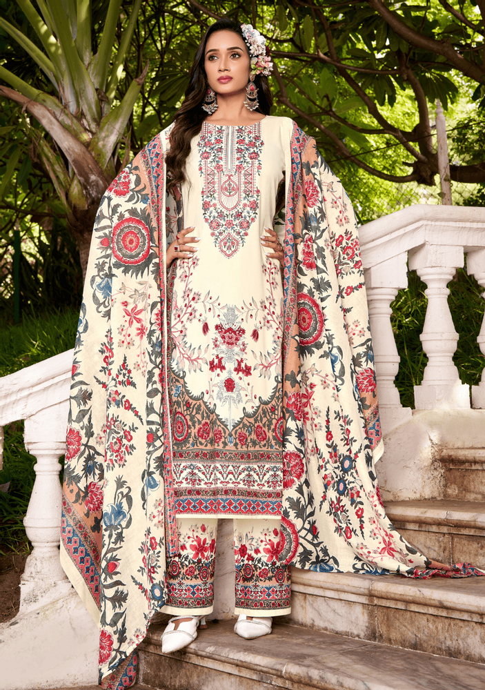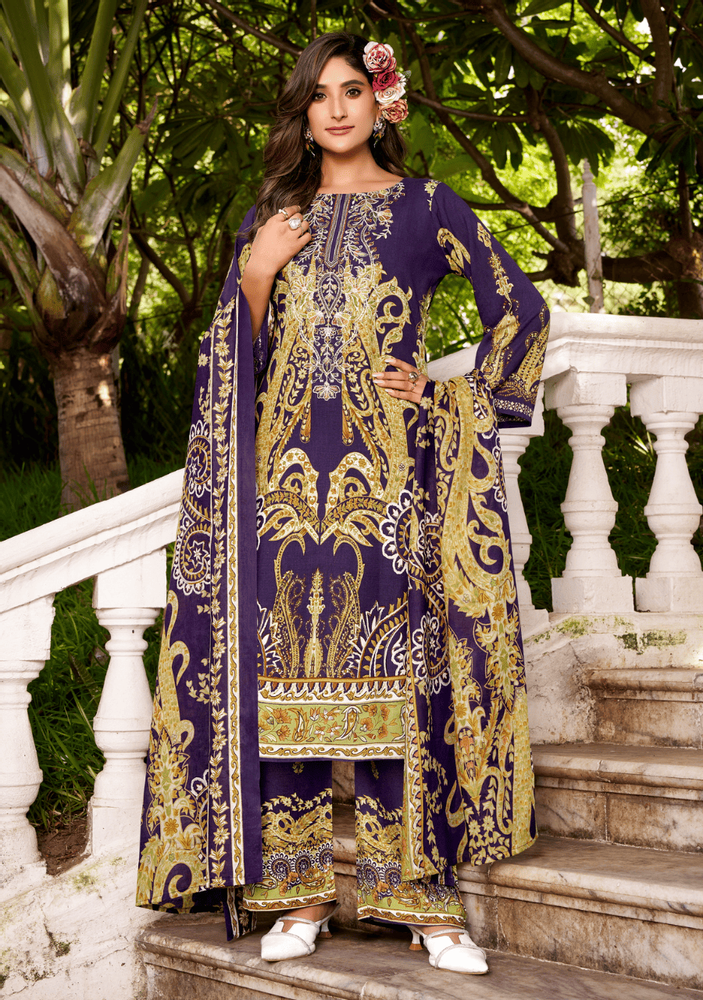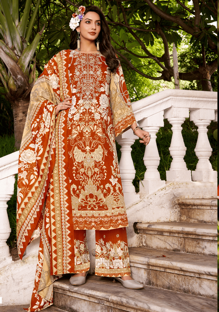 Mahira Vol 9 is a beautiful festive collection designed for comfort and elegant style. This suit set features a premium soft cotton digital print top enhanced with heavy self-embroidery, giving it a rich and stylish look. The soft mal mal cotton dupatta adds a light and graceful touch, while the printed cotton salwar provides all-day comfort.