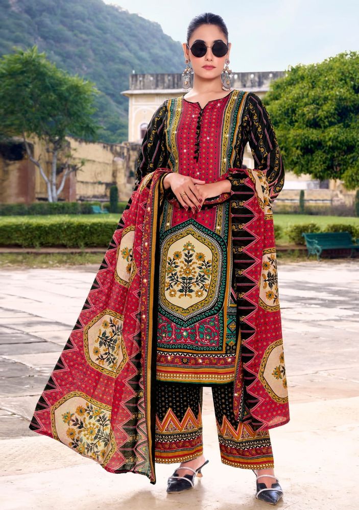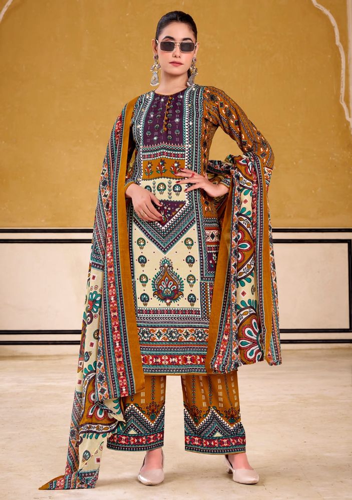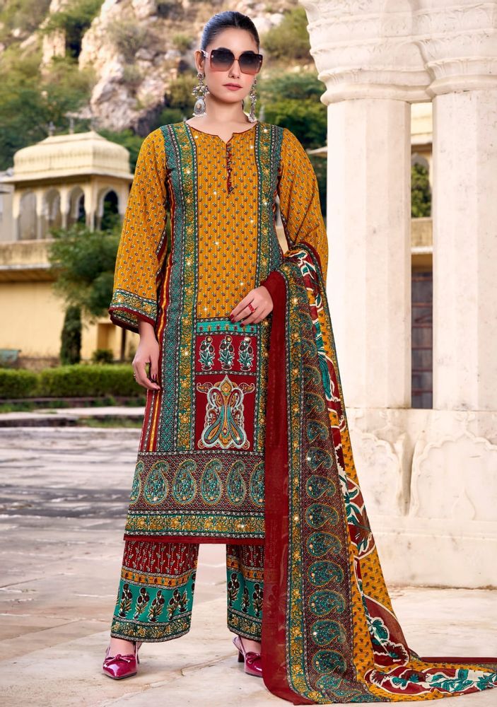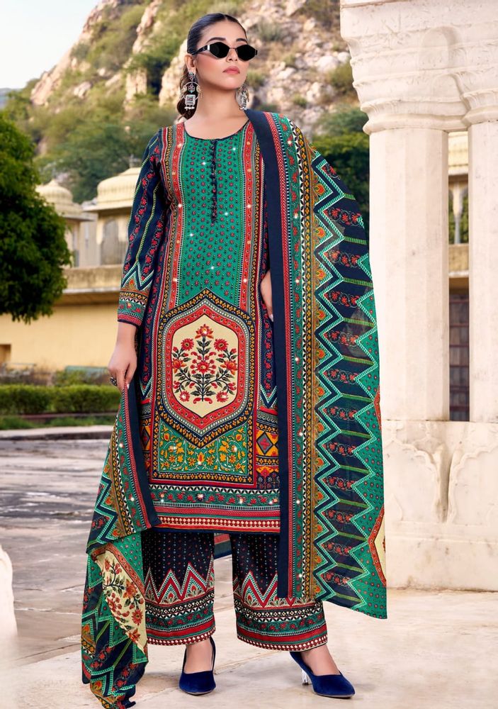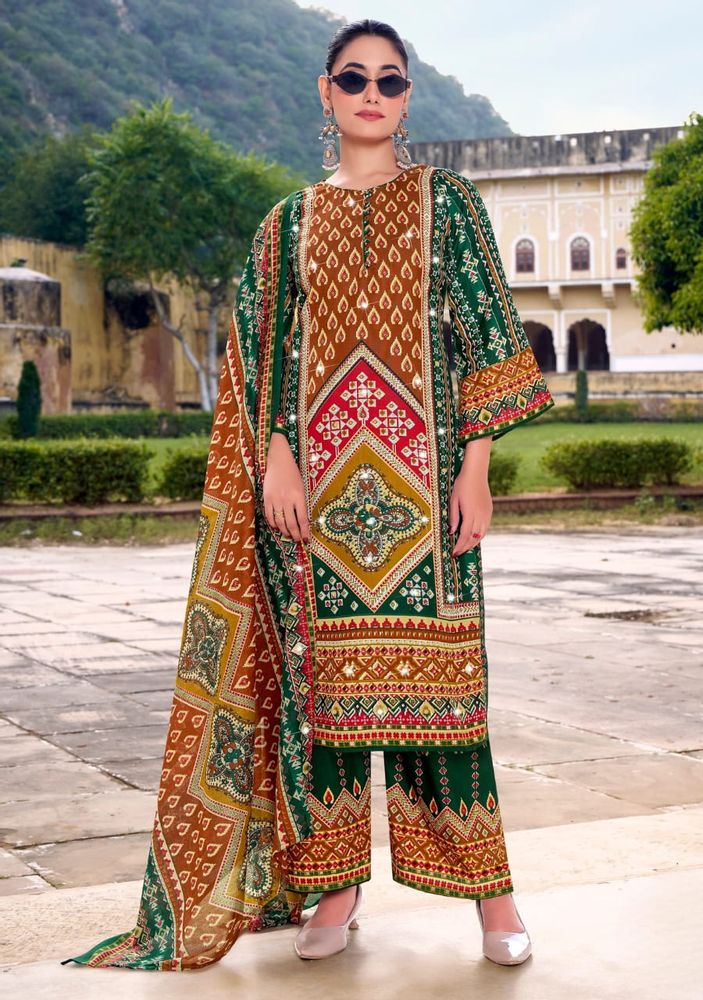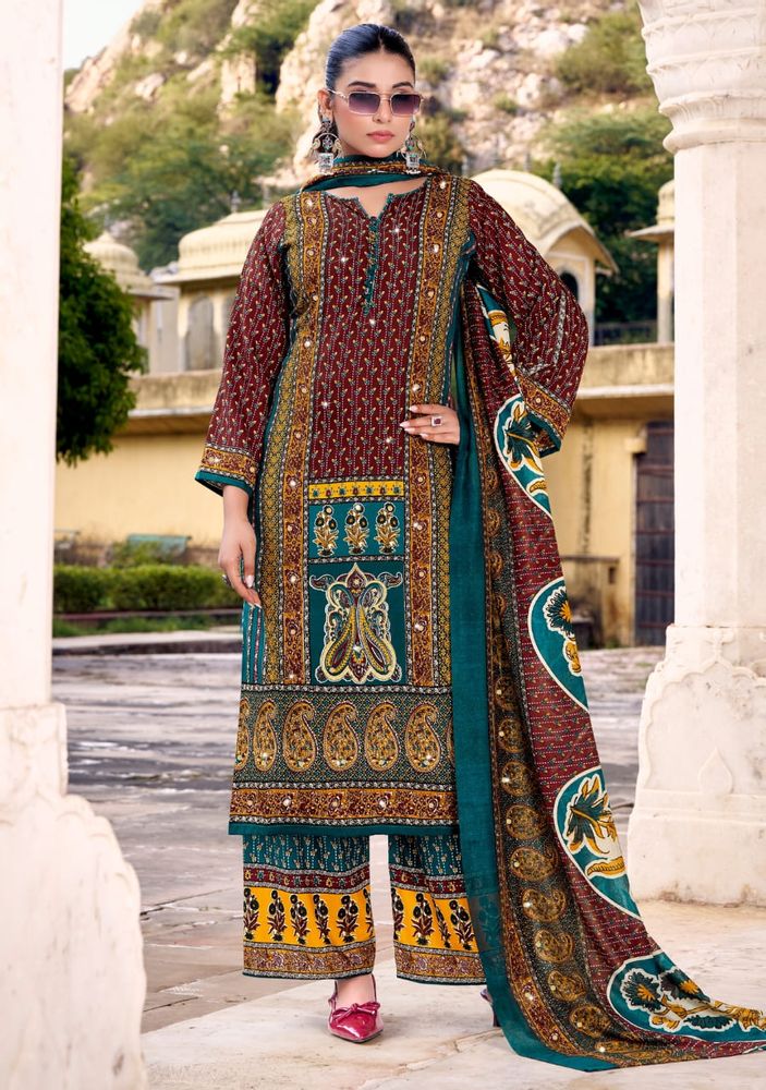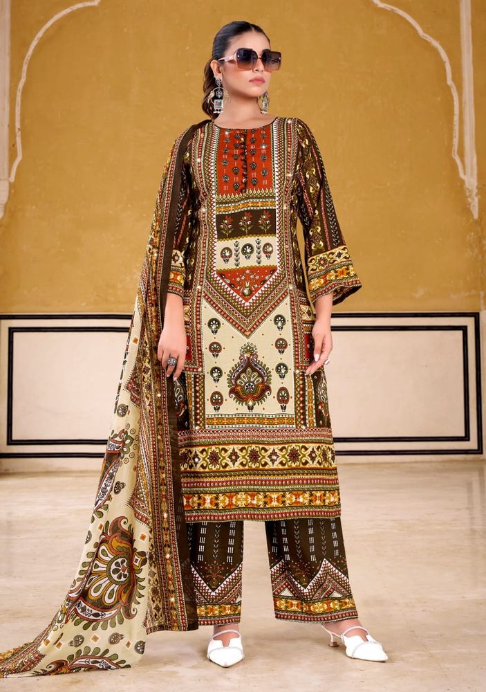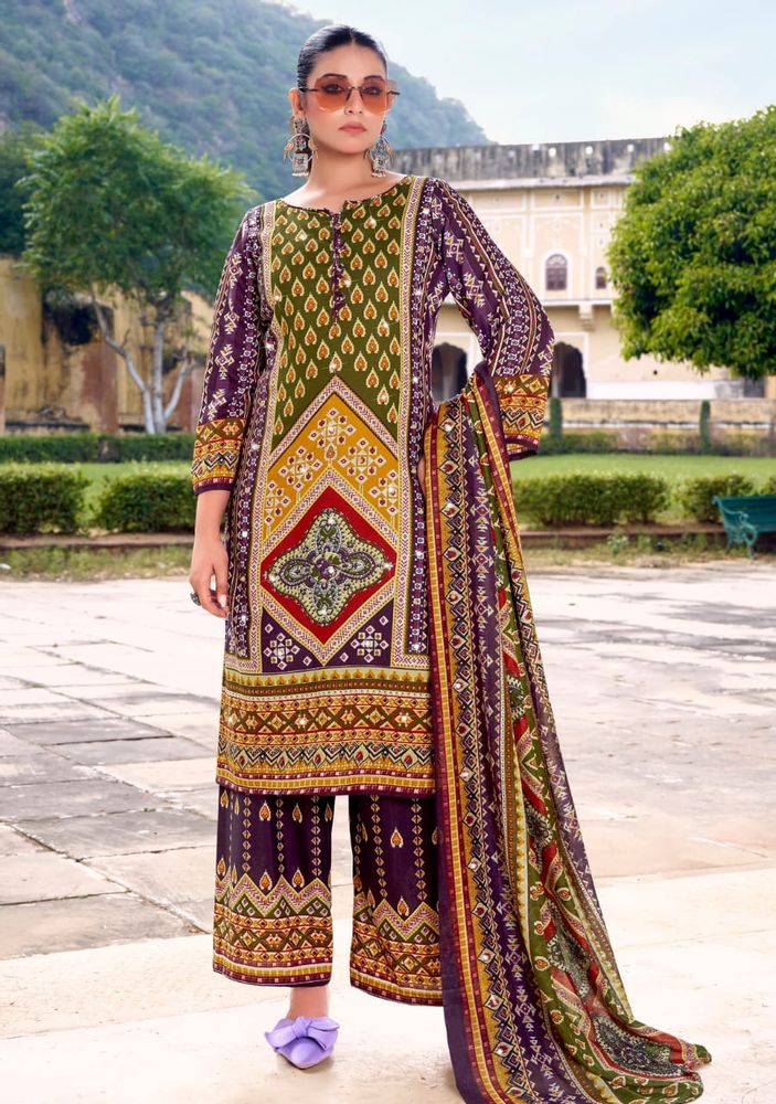 This stylish set is part of a premium ladies' suit catalogue, offering a modern suit design that suits both traditional and contemporary fashion needs. The outfit is paired with a soft and lightweight cotton muslin dupatta that enhances the overall look with a graceful touch. The printed rayon plazo adds comfort and a trendy finish.