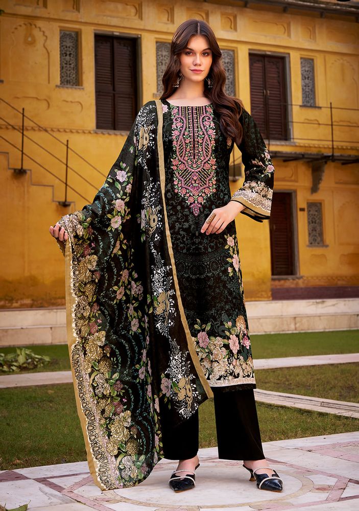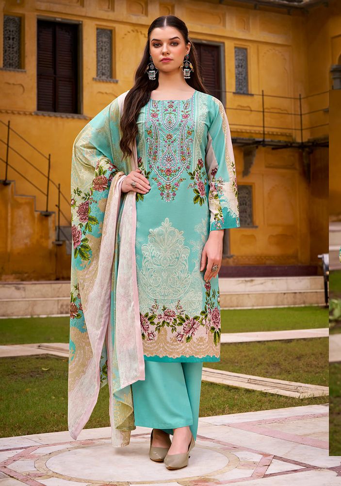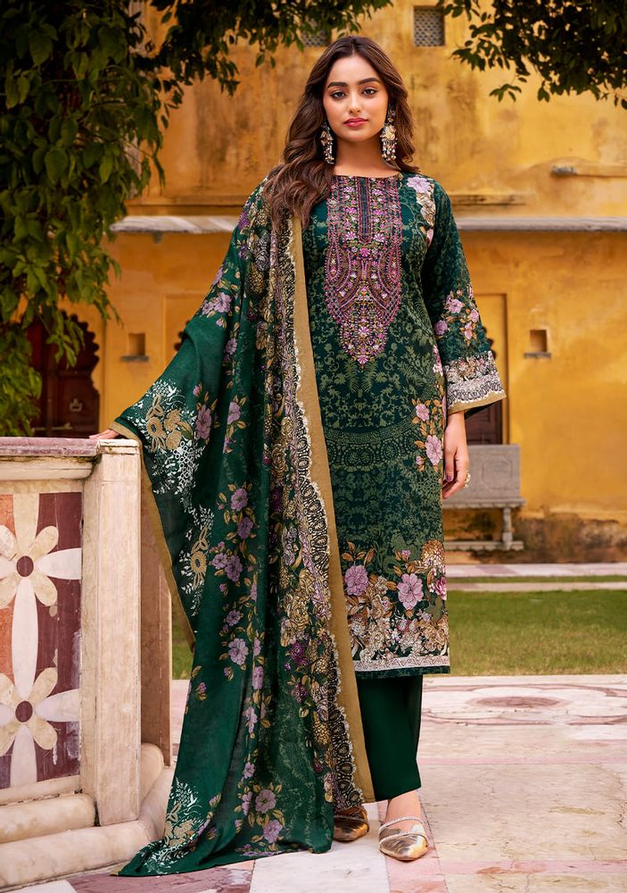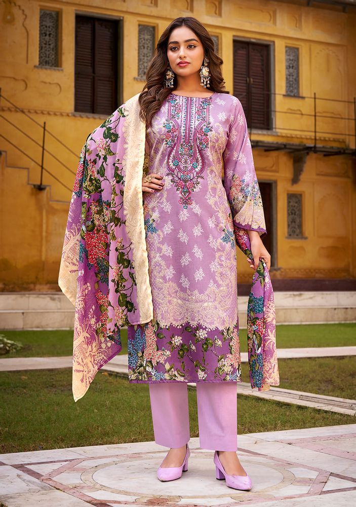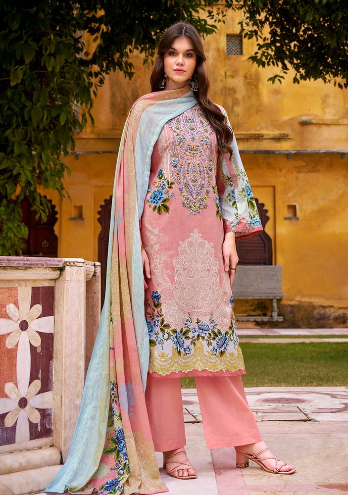 Crafted from 100% pure cotton, the top features exclusive heavy self-embroidery on rich digital prints, adding a graceful and detailed finish to your outfit. The pure Mal Mal cotton dupatta adds an airy charm with its lightweight texture and stunning digital design, while the cotton bottom ensures complete comfort and style.