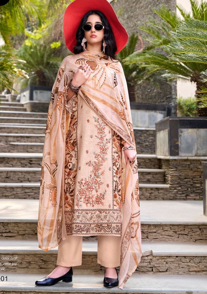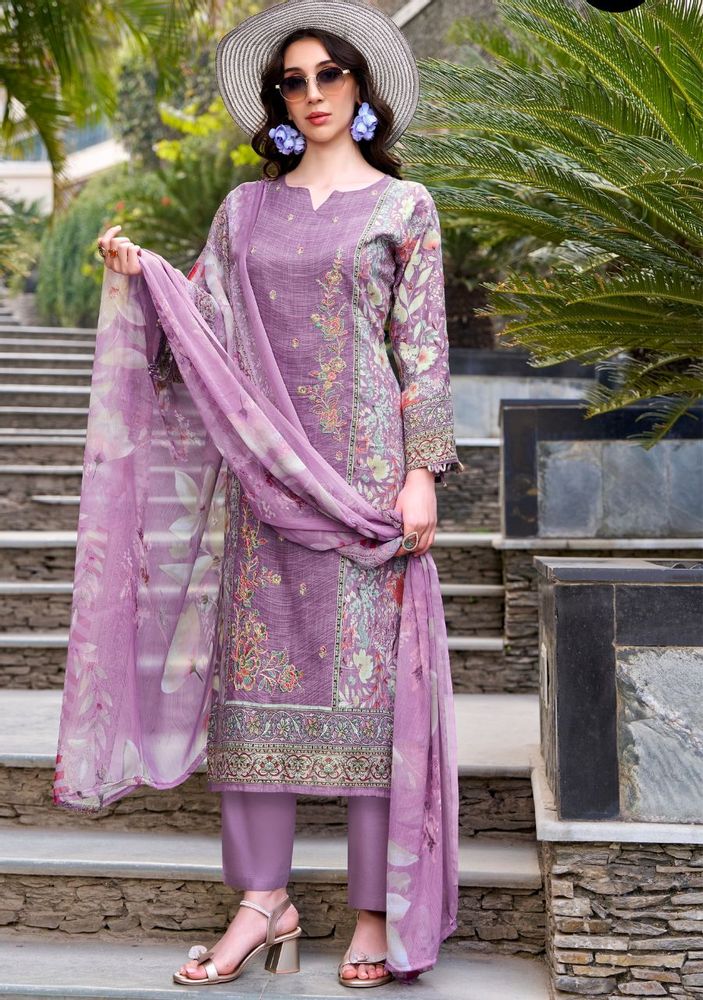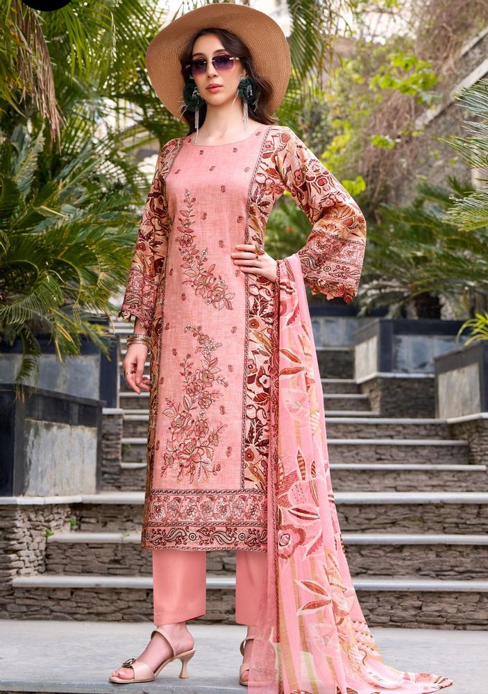 The top is crafted from 100% pure cotton linen and features stylish digital prints with exclusive heavy panel embroidery, giving it a rich and graceful appearance. The soft chiffon dupatta with digital print adds a light and flowing touch, while the pure cotton bottom provides comfort for daily and festive wear.