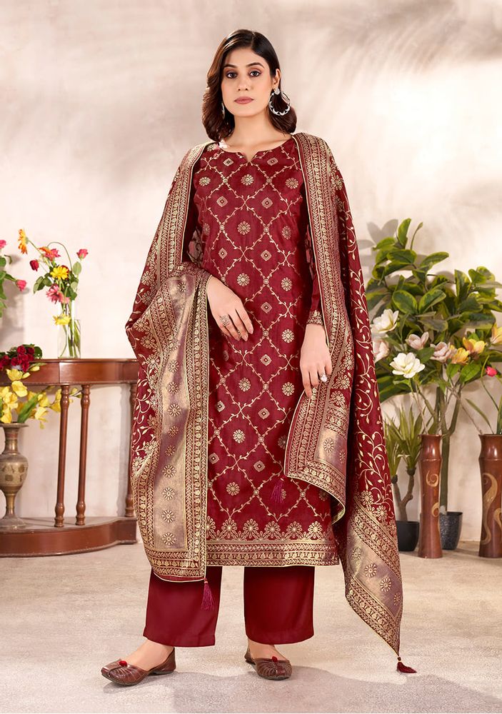 RUMI is a premium festive designer collection crafted in rich viscose dola silk jaquard, created for those who love elegant fabric and timeless style. The top is made from 100% pure viscose dola silk jaquard, offering a graceful texture and luxurious feel, perfect for festive and special occasions.