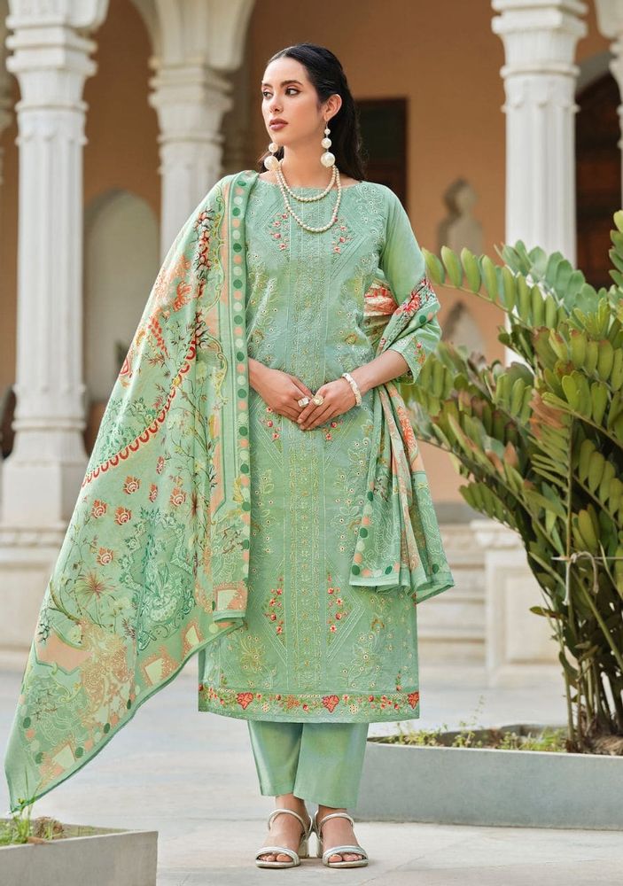 The set features a pure mal mal cotton dupatta with soft digital prints, adding a light and airy touch to the ensemble. It is paired with a 100% pure cotton bottom, offering ease and comfort throughout the day.