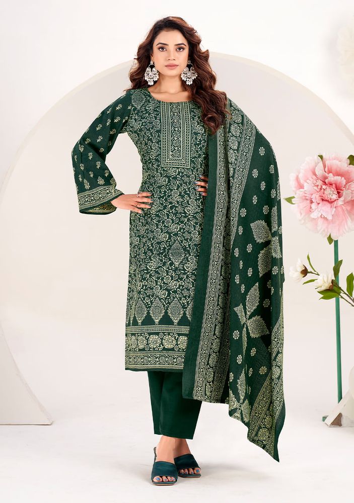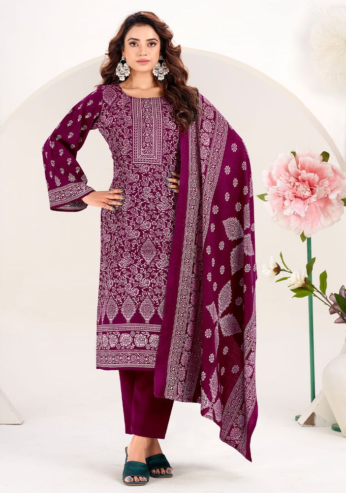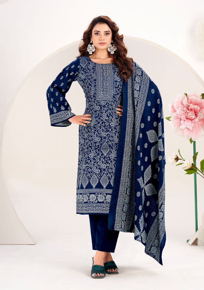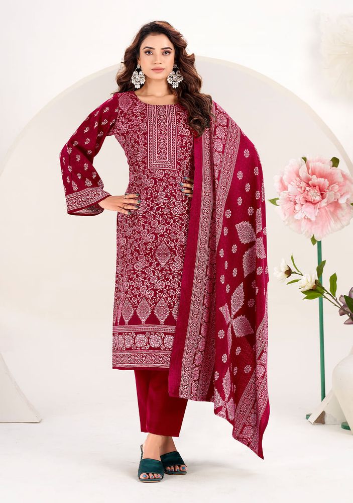 Each suit is made using 100% Pure Woollen Pashmina, giving the top a luxurious feel and smooth finish. The set includes a Pure Woollen Pashmina Shawl that adds warmth without compromising on elegance, and a Pure Woollen Spun Pashmina Bottom that completes the outfit with comfort and durability.